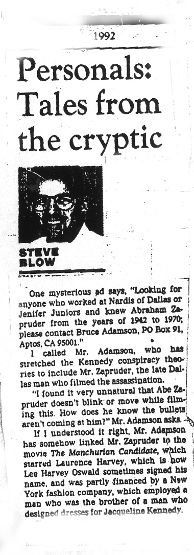 Adamson autho Richard Bartholomew told me that Erwin Schwartz was his "father-in-law" in 1995. Yet in his drop box "Oswald's Closest Friend, Review" he wrote that his father-in-law was now his wife's grandfather. In the 1990s Bart also wrote that I called his father-in-law, when it was actually the opposite: Erwin Schwartz called me in response to the advertisement I spent a small fortune advertising in The Dallas Morning News for three to four months. In Richard's so called "Review" he exaggerates the situation to sound like I was responsible for Erwin Schwartz's death. Schwartz indeed was upset over my request for any information on the Zapruder/de Mohrenschildt connection, but Erwin Schwartz had called me. See ad in gold frame below. Several times Bartholomew tells mistruths on the size of my volumes at 10,000 pages. I found nothing odd about Schwartz with Jennifer Juniors, except that his "son-in-law" Richard Ray Bartholomew wrote a story about a car being in the motorcade, the car that I am standing next to in his posted photograph. I believe that Richard traced the title to one Ruth Hyde Paine who passed away at age 92 in 2025. Before photograph was taken one lawyer James Lorin Silverberg was producing a film on the JFK assassination in 1992. Silverberg represented Abraham Zapruder's family in the copyright of the JFK assassination, including Oliver Stone's film JFK. Richard gave me copies of his artwork which I did not post on the internet as many have done in the JFK community. I am confused, is Schwartz his wife's father in law, grand niece, or granddaughter? In Richard's "Review" he wrote that he married the grandniece and granddaughter of Erwin Schwartz: "Author's note (Jan. 12, 2023): In 1985, I married 'Dana Ann' the granddaughter and niece, respectively, of Abraham Zapruder's business partners. Abe's wife, Lillian, was one of our wedding guests. Their daughter, Myrna, and her son Adam, who is a lawyer in Austin, are still family friends. My wife's uncle, Erwin M. Schwartz, told me his story often at family gatherings. In 1994, four years before he died at age 71..." Richard Bartholomew said nothing about the US government paying the Zapruder family heirs 16 million dollars for the copyright of Zapruder's film of JFK's demise in 1999. I am only the messenger and Richard goes out of his way to take pot shots at my reputation. Or was he protecting his wife's reputation and relationship to law firm James Lorin Silverberg?