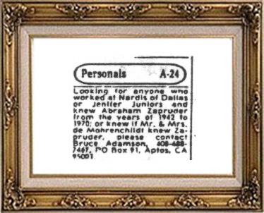 In early 1992 I ran the above ad in The Dallas Morning News, for I wanted to find out if there was more to the relationship Abraham Zapruder and Jeanne Le Gon-de Mohrenschildt when they worked together at a Dallas clothing store: Nardis of Dallas in 1953. I knew that they both worked there ten years before JFK's demise on Nov. 22, 1963. It was not natural when Zapruder filming the assassination did not react for his own safety and kept panning his camera without reacting for his own safety when the JFK was shot and killed. I received about five responses from the advertisement, one being from Burt Weenick, who was a manager at Nardis of Dallas, and he confirmed in writing that they Jeanne Le Gon and Zapruder were friends and worked together. I did not find anything negative on Jennifer Juniors, a company where Zapruder and Erwin Schwartz were partners. No one reacted like the people did in the line of Zapruder's filming falling to the ground or looking to the direction of bullets. Erwin Schwartz is related to Dana Ann Silverberg-Bartholomew wife of Richard Ray Bartholomew (a so-called JFK researcher). I am sorry Schwartz had to die of a natural cause, yet it does not compare to the importance of the assassination of President John F. Kennedy on November 22, 1963. Who benefitted the most? The Zapruder family and the Silverberg law firm? I was more interested on Zapruder's ties to the de Mohrenschildt's in 1953; and what led up to Zapruder becoming a 33 degree Mason, whose title is known for keeping the secrets. Zapruder also belonged to the Pentagon Lodge in Dallas. Richard Ray Bartholomew married one Dana Ann {Silverberg] and they made their home in Plugerviller, TX, outside of Austin, Texas. The marriage was in Dallas County, Texas on June 1, 1985 (Document # 852570600). The de Mohrenschildt's and Zapruder's attended